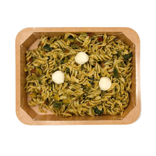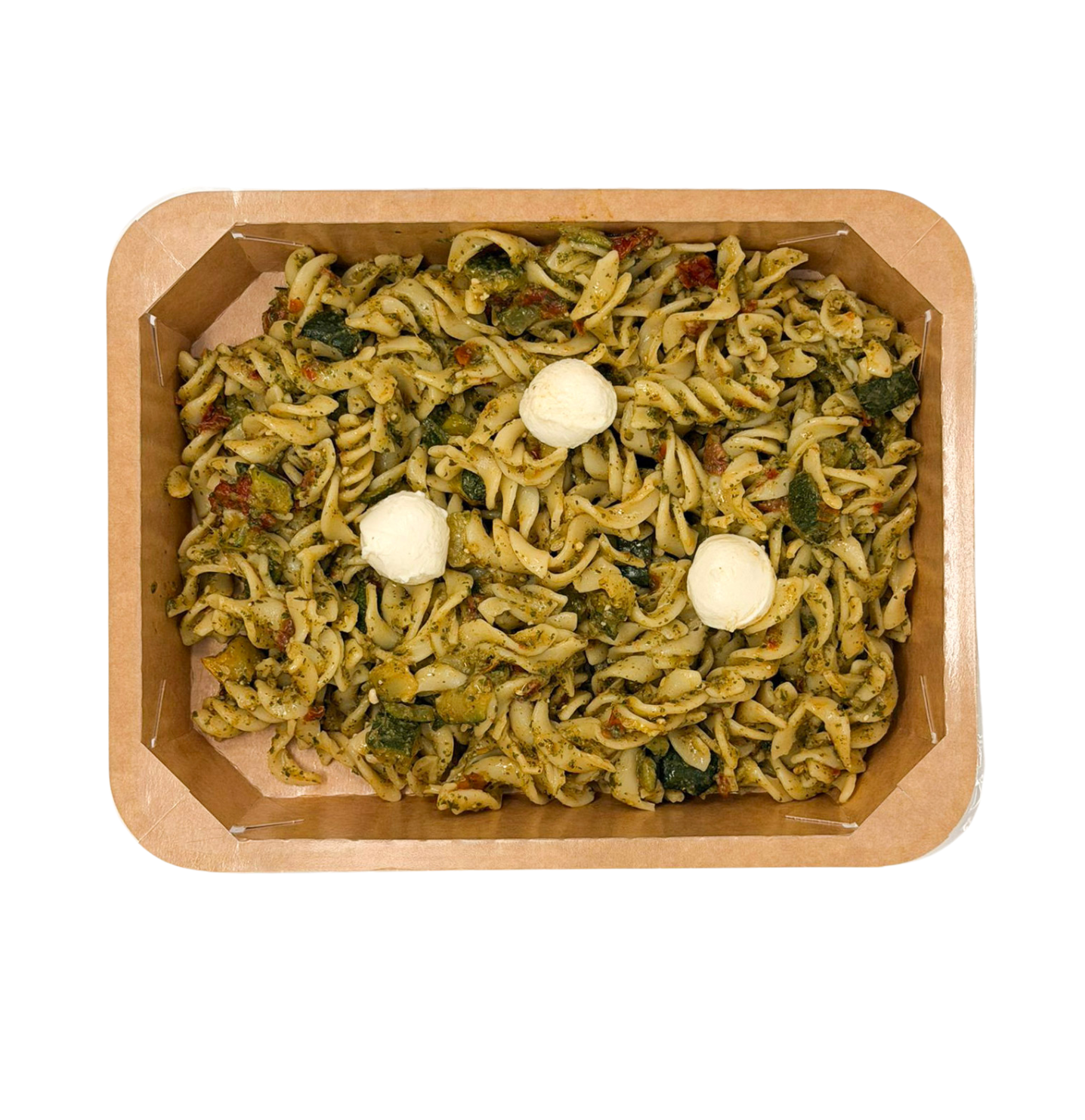 Pâtes au pesto, tomate séchée, courgette grillée et mozzarella / Pasta met pesto, zongedroogde tomaat, gegrilde courgette en mozzarella