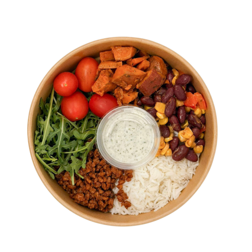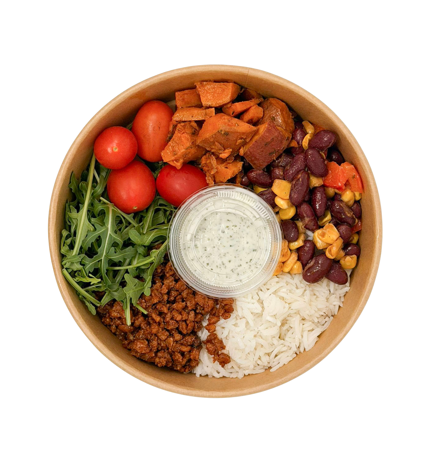 Riz, soja texturé, haricots noirs, légumes frais et sauce verte / Rijst, getextureerde soja, zwarte bonen, verse groenten en groene saus