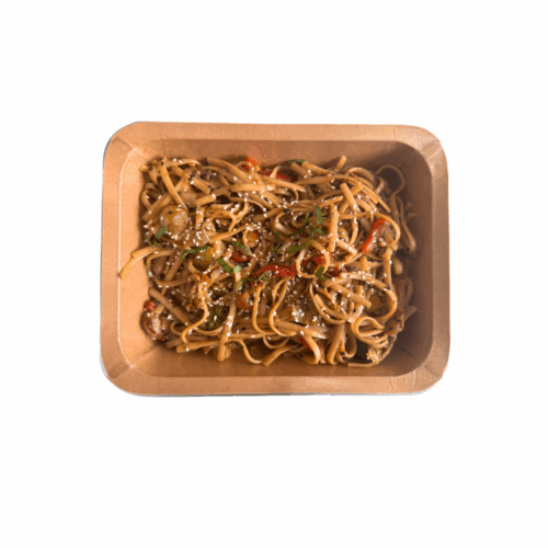 Linguine au poulet, sauce teriyaki, poivrons, brocolis et carottes./ Linguine met kip, teriyakisaus, paprika, broccoli en wortelen.