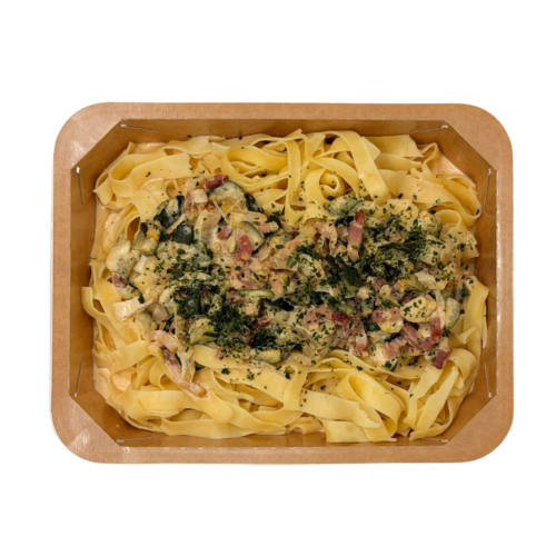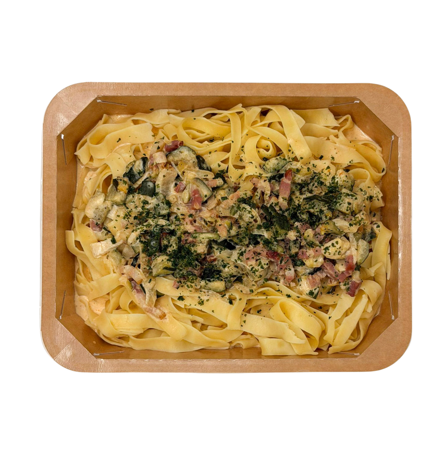 Tagliatelle aux lardons, courgette, tomate confite et crème / Tagliatelle met spekreepjes, courgette, gekonfijte tomaat en room