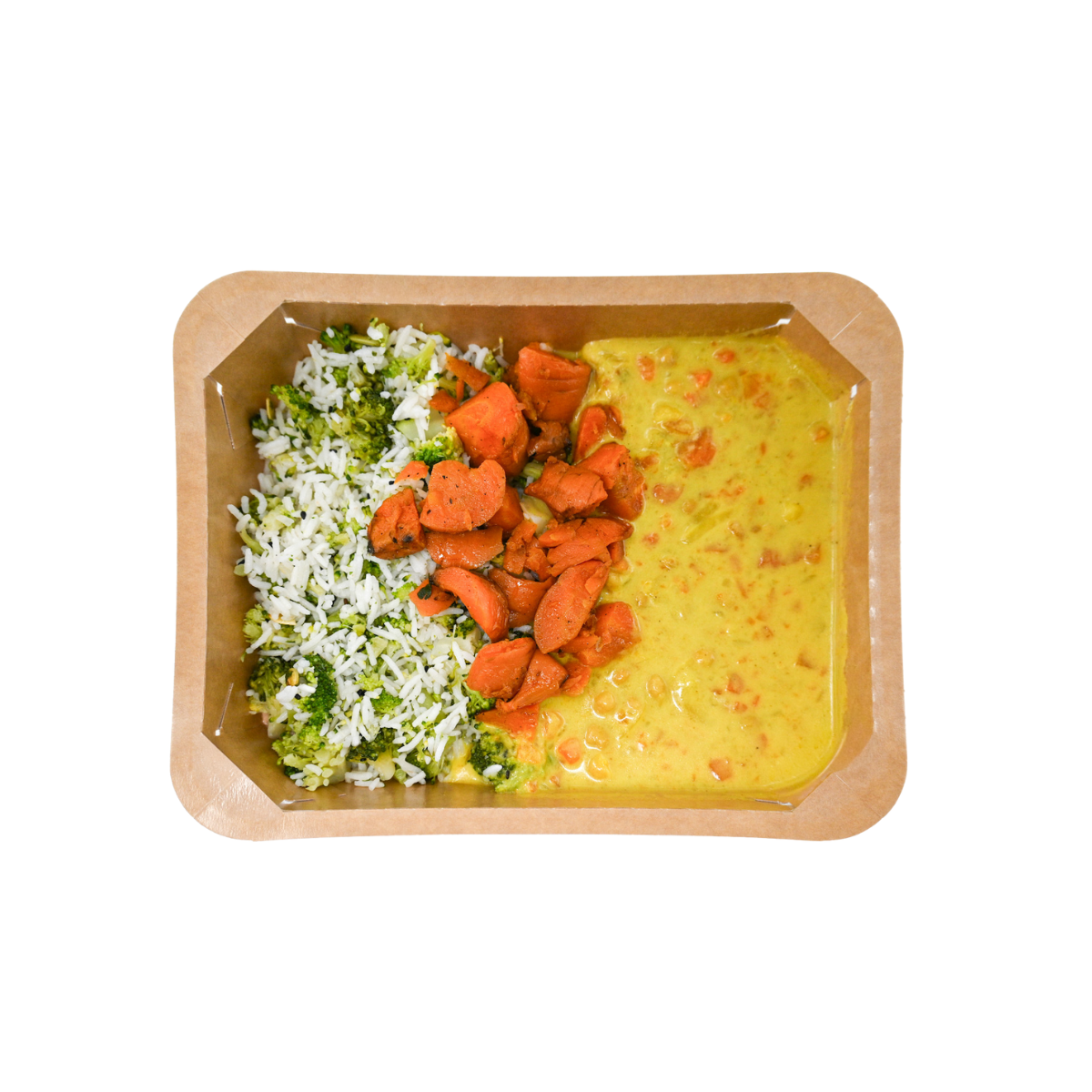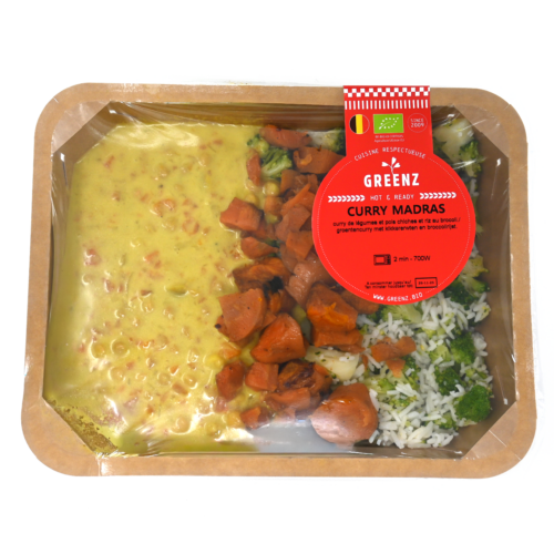 Curry de légumes et pois chiches et riz au brocoli./ groentencurry met kikkererwten en broccolirijst.