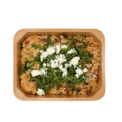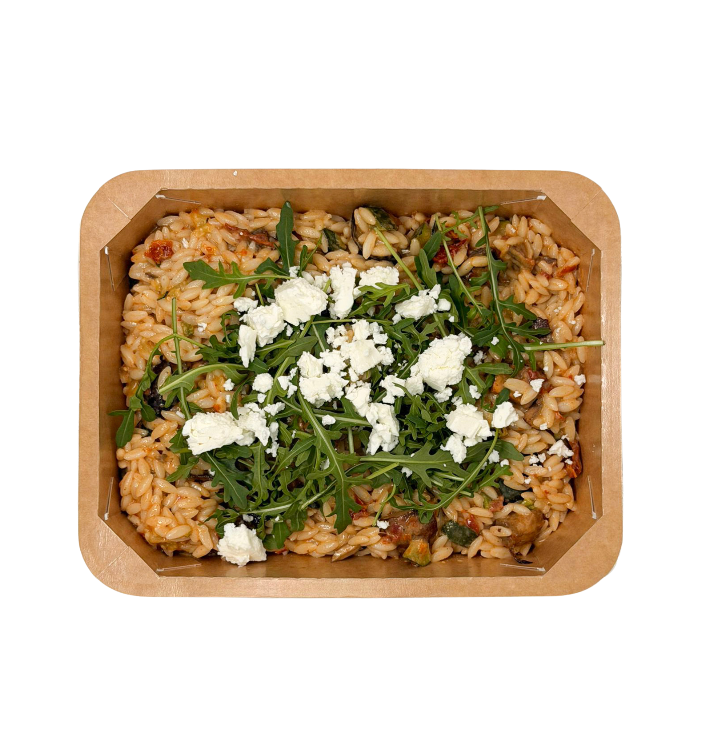Orzo, aubergine, courgette, olive, tomate cerise, feta, champignon / Orzo, aubergine, courgette, olijf, kerstomaat, feta, champignon