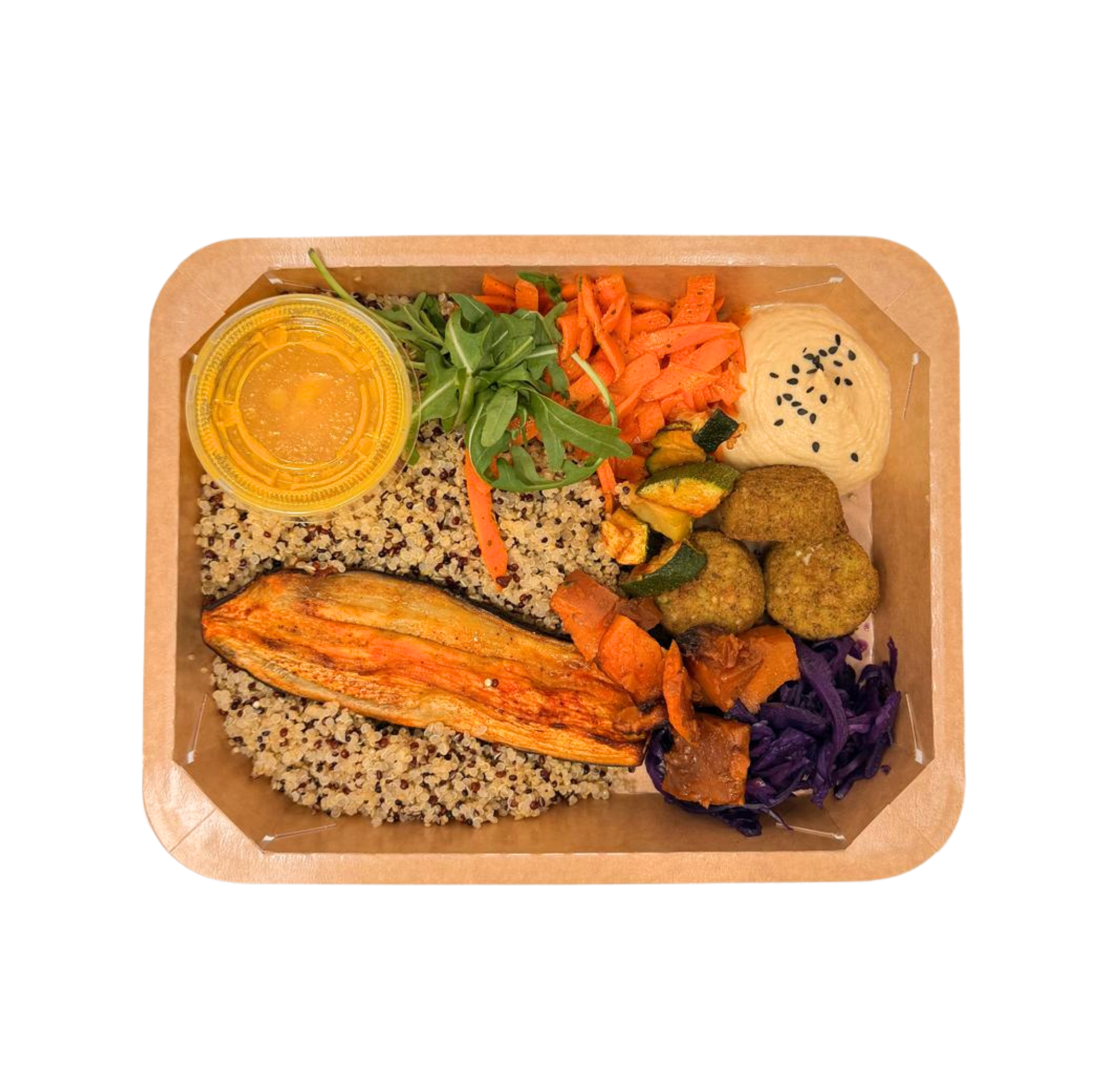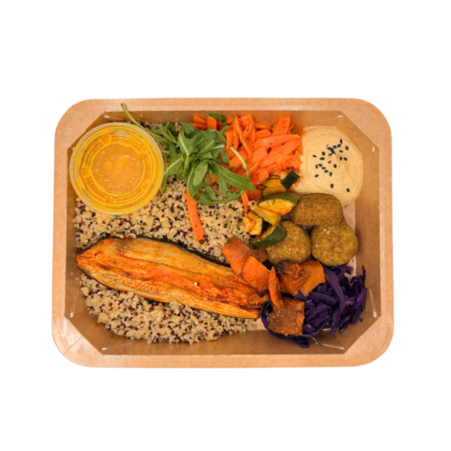 Quinoa, légumes rôties, falafel, houmous, pickles de chou rouge et sauce orange-curcuma / Quinoa, geroosterde groenten, falafel, hummus, ingelegde rodekool en sinaasappel-kurkumasaus