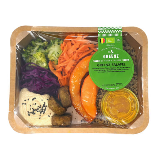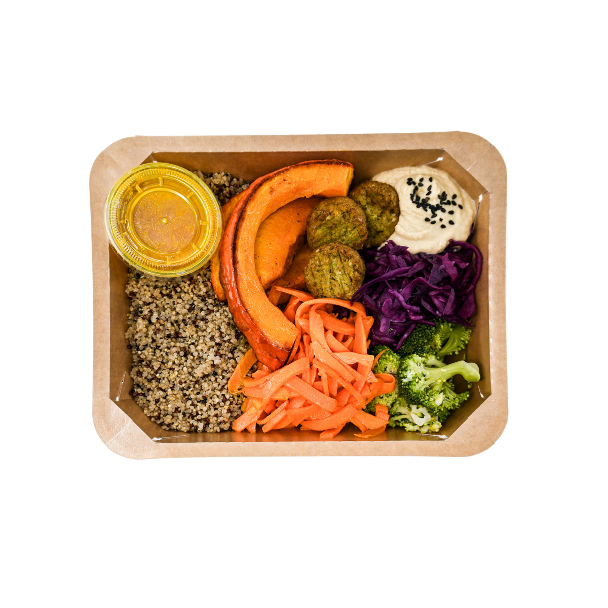 Salade de quinoa, falafel, légumes, houmous et sauce curcuma-orange./ quinoasalade, falafel, groenten, hummus en kurkuma-sinaasappelsaus.