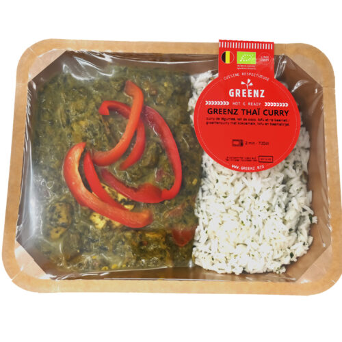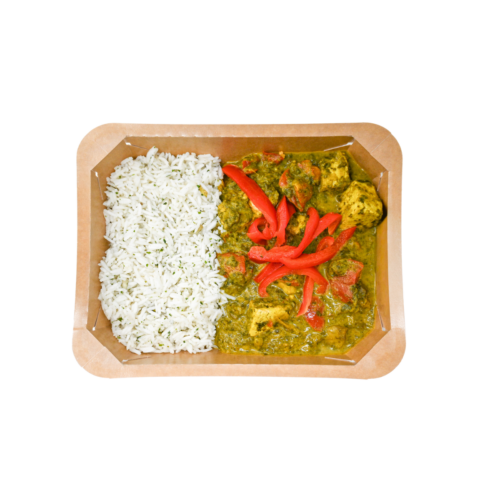 Curry au lait de coco, tofu et légumes grillés, accompagné de riz basmati./ Kokosmelkcurry met tofu en gegrilde groenten, geserveerd met basmatirijst.