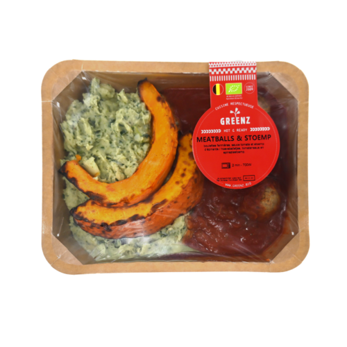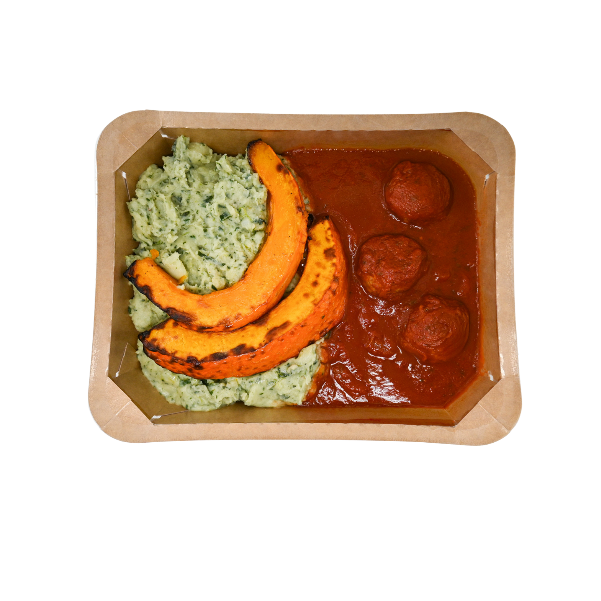 Boulettes fermières, sauce tomate et stoemp d’épinards./ hoeveballetjes, tomatensaus en spinaziestoemp.