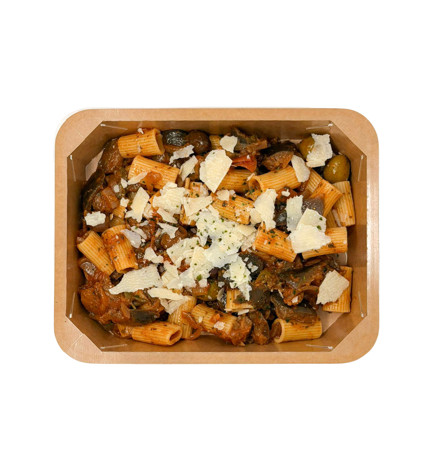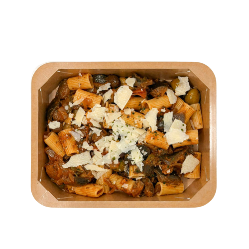 Rigatoni, légumes rôtis style ratatouille: aubergine, tomate, olives, câpres, roquette, parmesan / Rigatoni met geroosterde groenten in ratatouillestijl: aubergine, tomaat, olijven, kappertjes, rucola en parmezaan
