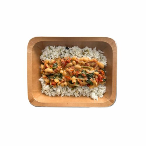 Riz aux graines de courge, accompagné d’une sauce crémeuse aux haricots, lait de coco et beurre de cacahuète, ainsi que de tomates confites et d’épinards./ Rijst met pompoenpitten, vergezeld van een romige saus met bonen, kokosmelk en pindaboter, afgewerkt met gekonfijte tomaten en spinazie.