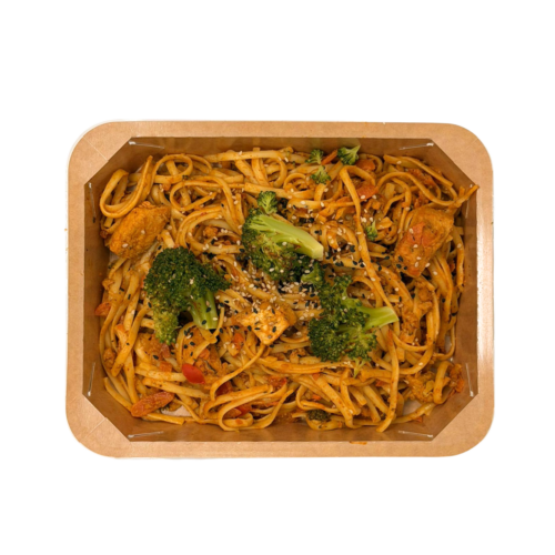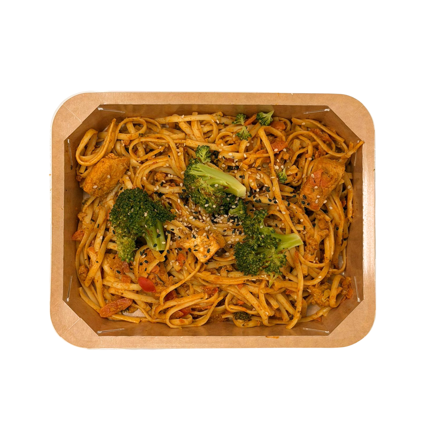 Linguine au poulet sauce cacahuète, poivron, brocoli, pousse de soja / Linguine met kip, pindasaus, paprika, broccoli en sojascheuten