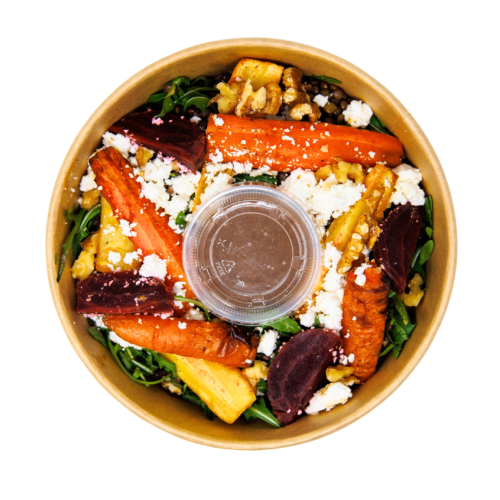 Salade de lentilles aux légumes de saison, feta et vinaigrette balsamique./ linzensalade met seizoensgroenten, feta en balsamicodressing.