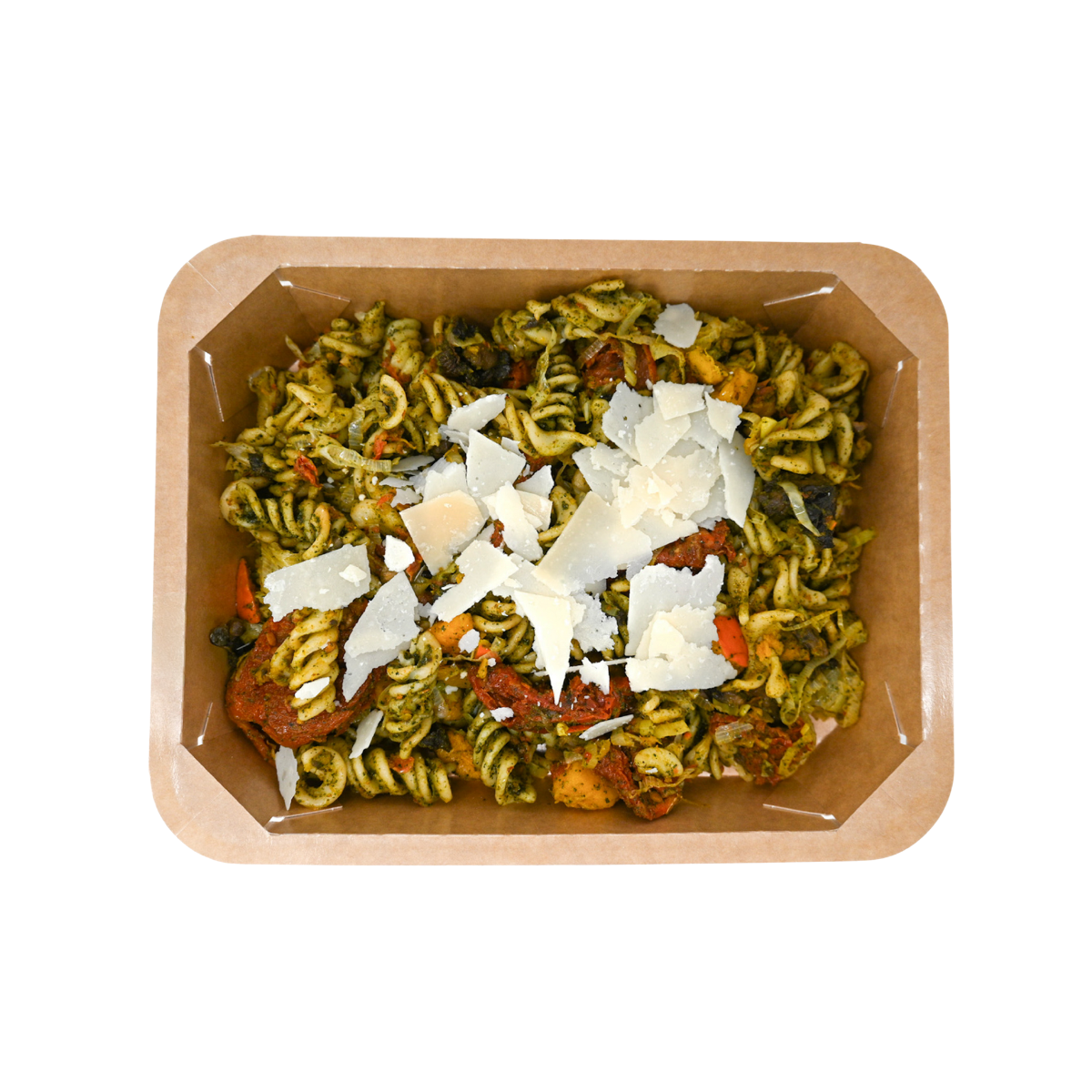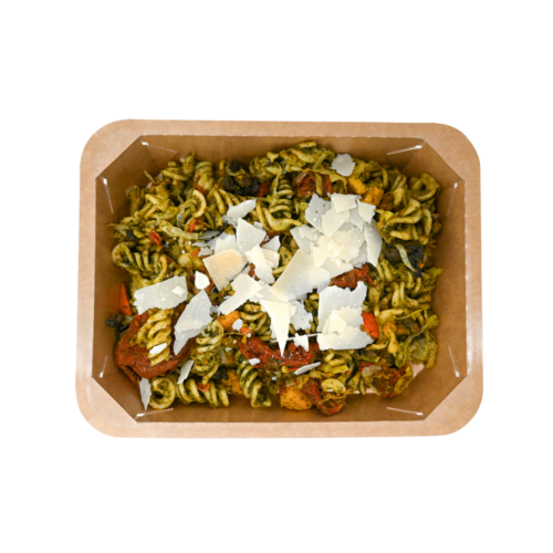 Fusilli au pesto de basilic, légumes savoureux et parmesan AOP./ fusilli met basilicumpesto, smaakvolle groenten en Parmezaan AOP.