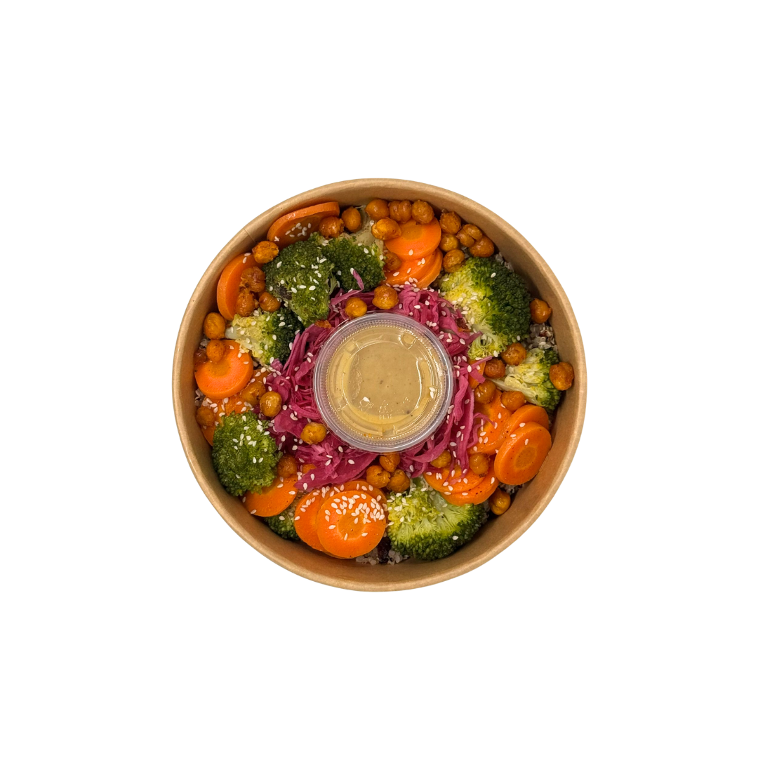 Quinoa gourmand aux légumes vapeur, pois chiches et sauce moutarde-agave / Quinoa met gestoomde groenten, kikkererwten en agave-mosterdsaus
