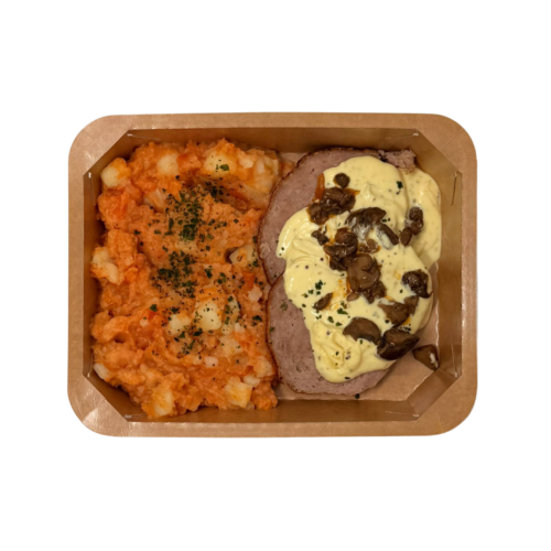 Pain de viande fermier et stoemp de carottes, une sauce moutarde./ hoevevleesbrood met wortelstoemp en mosterdsaus