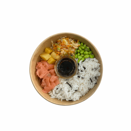 Riz japonais, saumon fumé, carotte, chou blanc, edamame, hiziki, mangue, sauce soja