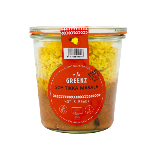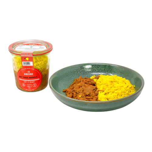Riz basmati sauté (ail, gingembre, curcuma), lentilles beluga, sauce crémeuse tikka masala au yaourt de soja et soja texturé / Gebakken basmatirijst (knoflook, gember, kurkuma), beluga linzen, romige tikka masala saus met sojayoghurt en textuursoja