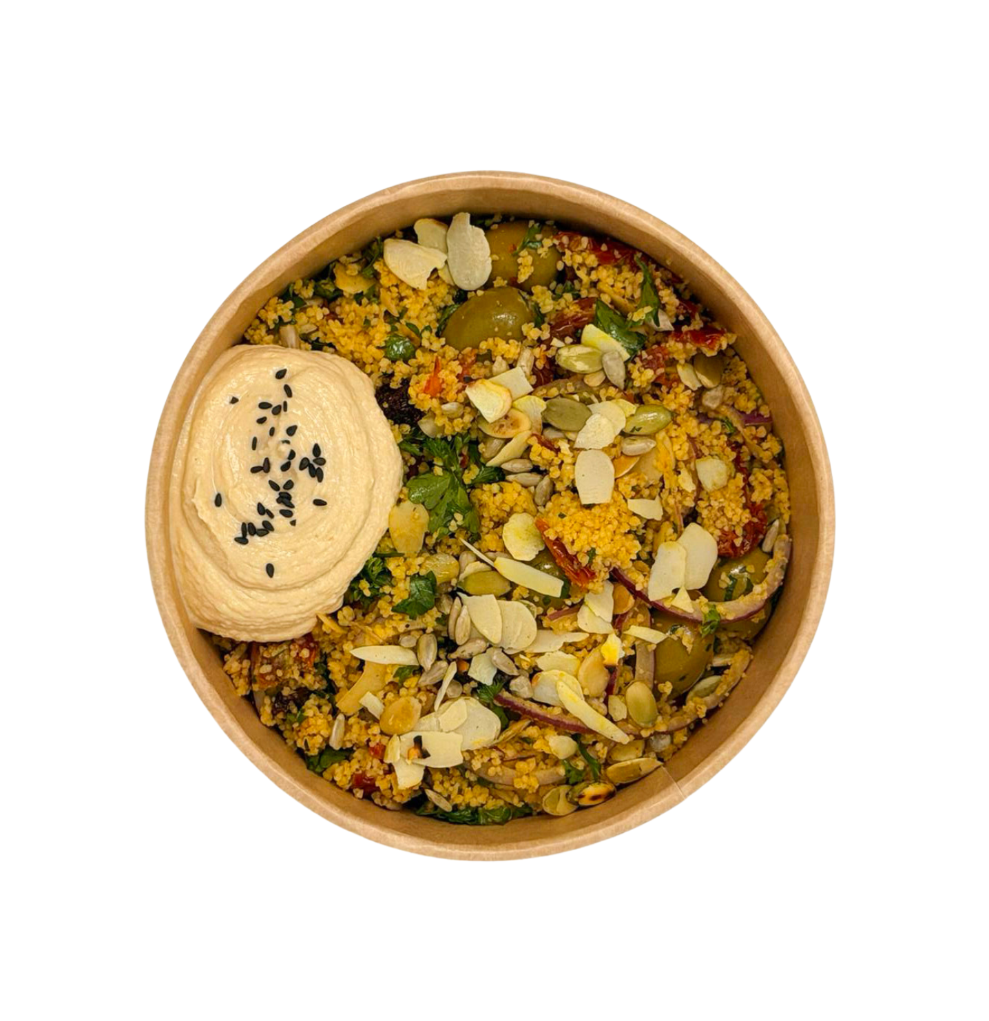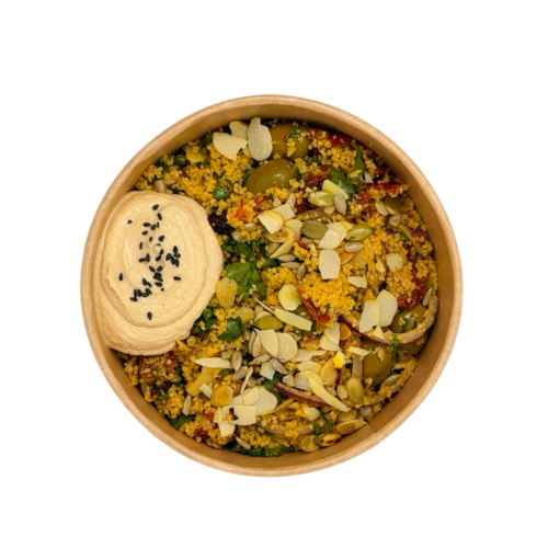 Couscous, tomates séchées, amandes, raisins secs, houmous / Couscous, zongedroogde tomaten, amandelen, rozijnen, hummus