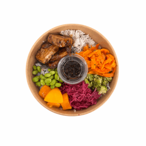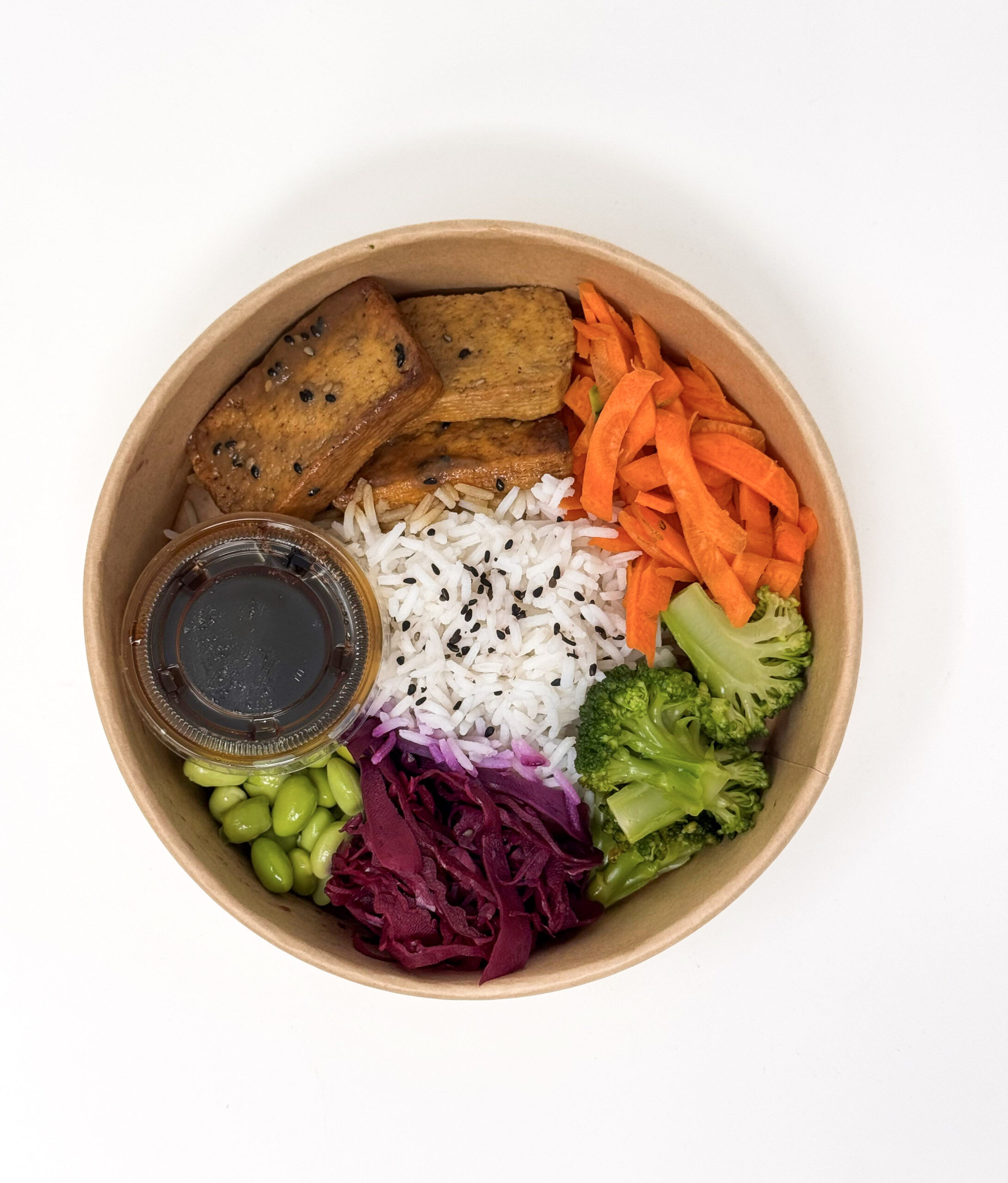 Riz, tofu sauce teriyaki, brocoli, carotte, chou rouge, edamame, mangue